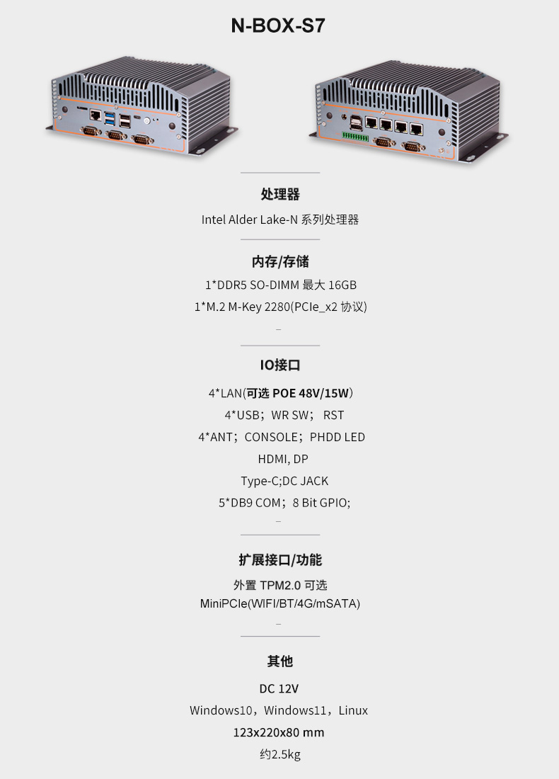 諄勤智能N-BOX-S7工控機(jī)搭載Intel Alder Lake-N 系列處理器,多核多線程能加速圖像算法的執(zhí)行;配合 GPU可以學(xué)習(xí)優(yōu)化視覺(jué)算法;DDR5內(nèi)存插槽和M.2的存儲(chǔ)接口,能為檢測(cè)系統(tǒng)提供足夠的存儲(chǔ)容量,大幅縮短圖像處理的時(shí)間,提高系統(tǒng)的實(shí)時(shí)性。